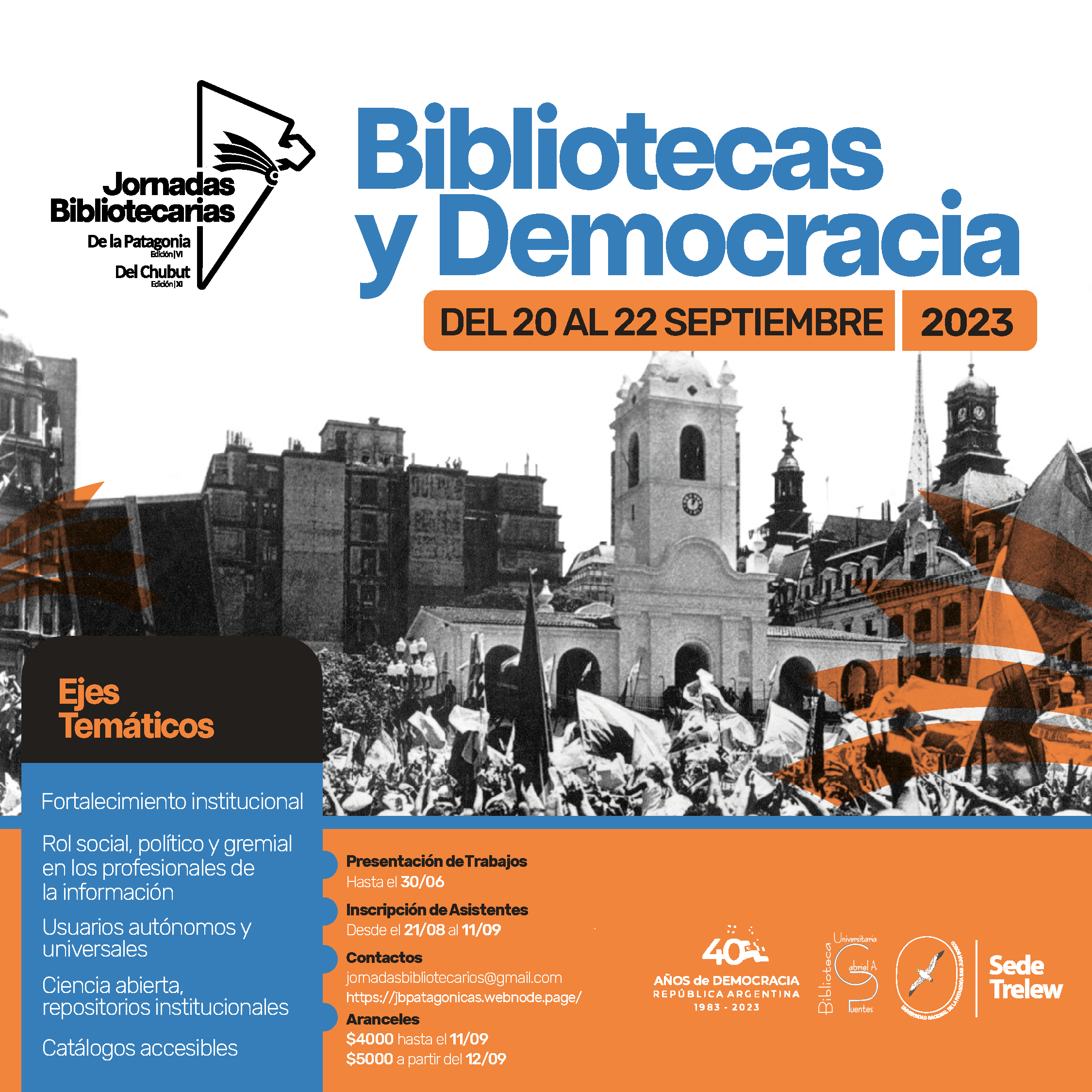 Los días 20, 21 y 22 de septiembre del año 2023 se desarrollarán en la Sede Trelew de la Universidad Nacional de la Patagonia San Juan Bosco las VI Jornadas Bibliotecarias de la Patagonia y XI Jornadas Bibliotecarias del Chubut "Bibliotecas y democracia".